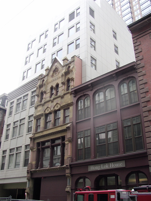 Preservation and restoration of the facades of 3 nineteenth century commercial buildings combined into a new infill building with an 8 story addition to create a unified new building for 75 units of senior housing. New senior center and adult day health program space at ground floor. Project is designed to be built in two phases to accommodate relocation of 28 existing residents in the existing Hong Lok building. Project is within the Essex Street Historic District and requires Section 106 review and approval.